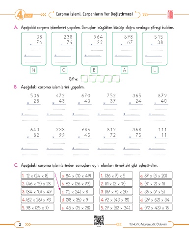 A. Aşağıdaki çarpma işlemlerini yapalım. Sonuçları büyükten küçüğe doğru sıralayıp şifreyi bulalım.