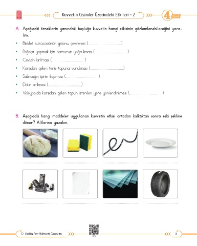 A. Aşağıdaki örneklerin yanındaki boşluğa kuvvetin hangi etkisinin gözlemlenebileceğini yaza-