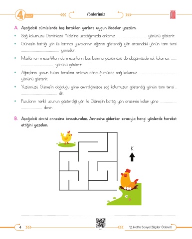 B. Aşağıdaki civcivi annesine kavuşturalım. Annesine giderken sırasıyla hangi yönlerde hareket
