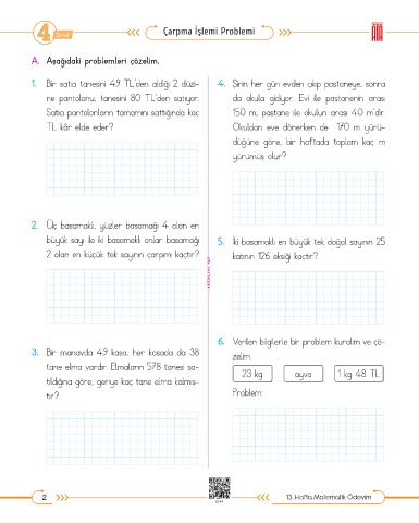 1. Bir satıcı tanesini 49 TL’den aldığı 2 düzi- 4. Şirin her gün evden çıkıp pastaneye, sonra