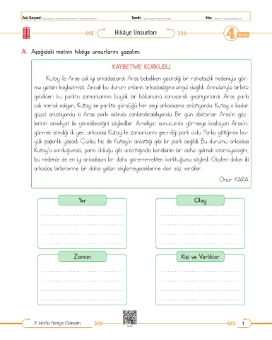 A. Aşağıdaki metnin hikâye unsurlarını yazalım.