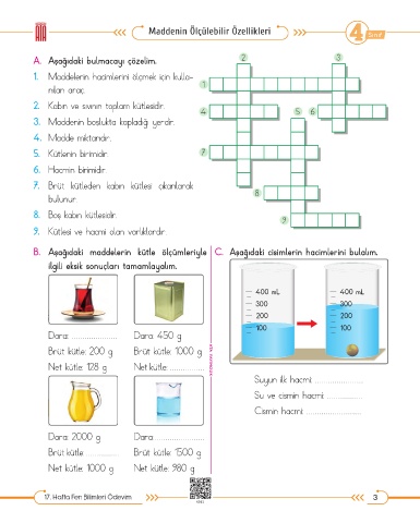 B. Aşağıdaki maddelerin kütle ölçümleriyle C. Aşağıdaki cisimlerin hacimlerini bulalım.