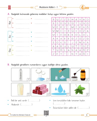 A. Aşağıdaki bulmacada gizlenmiş maddeleri bulup uygun bölüme yazalım.