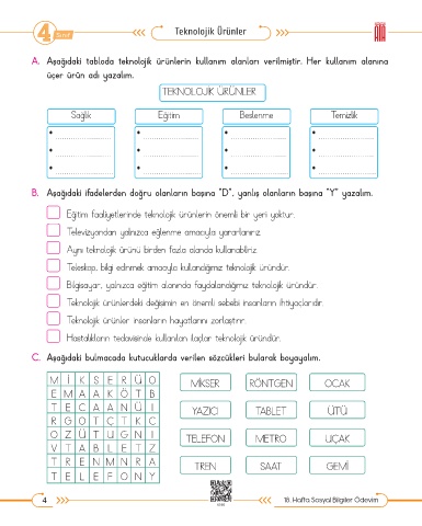 A. Aşağıdaki tabloda teknolojik ürünlerin kullanım alanları verilmiştir. Her kullanım alanına