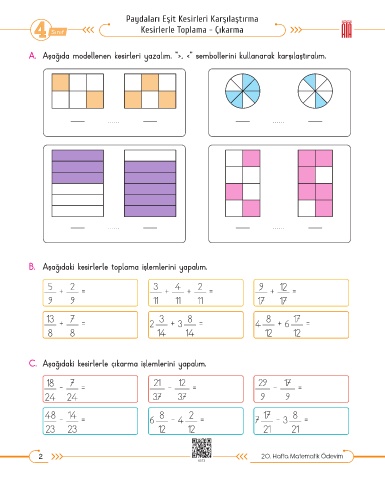 A. Aşağıda modellenen kesirleri yazalım. “>, <” sembollerini kullanarak karşılaştıralım.