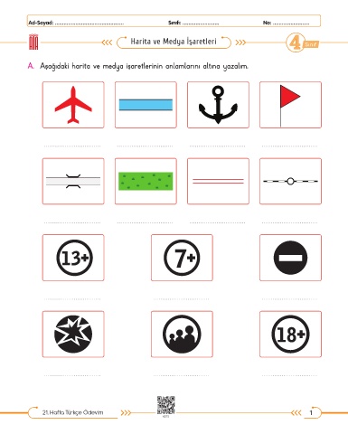 A. Aşağıdaki harita ve medya işaretlerinin anlamlarını altına yazalım.