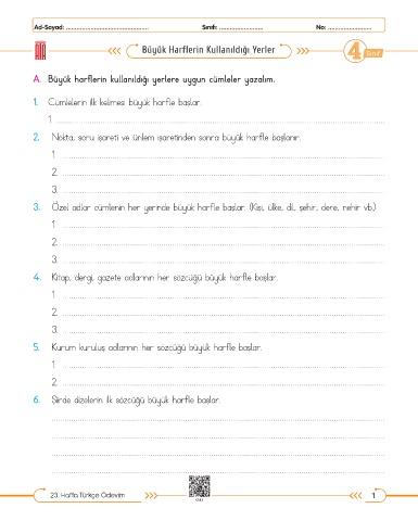A. Büyük harflerin kullanıldığı yerlere uygun cümleler yazalım.