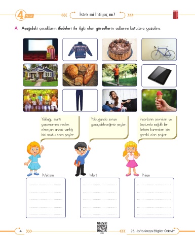 A. Aşağıdaki çocukların ifadeleri ile ilgili olan görsellerin adlarını kutulara yazalım.