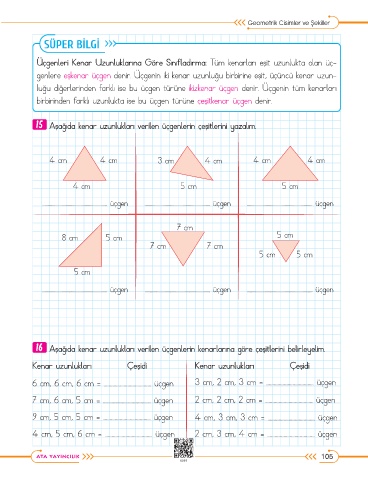 16 Aşağıda kenar uzunlukları verilen üçgenlerin kenarlarına göre çeşitlerini belirleyelim.