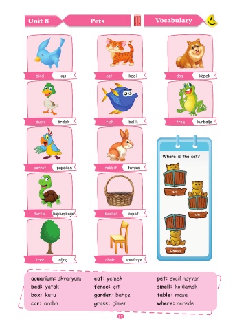 Unit 8 Pets aquarium: akvaryum eat: yemek pet: evcil hayvan bed: yatak fence: çit smell: koklamak box: kutu garden: bahçe table: masa car: araba grass: çimen where: nerede 79