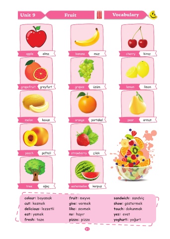 Unit 9 Fruit colour: boyamak fruit: meyve sandwich: sandviç cut: kesmek give: vermek show: göstermek delicious: lezzetli like: sevmek touch: dokunmak eat: yemek no: hayır yes: evet fresh: taze pizza: pizza yoghurt: yoğurt 91