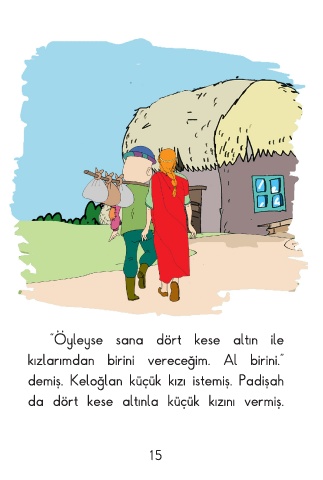 “Öyleyse sana dört kese alt›n ile k›zlar›mdan birini vereceğim. Al birini.” demiş. Keloğlan küçük k›z› istemiş. Padişah da dört kese alt›nla küçük k›z›n› vermiş. 15