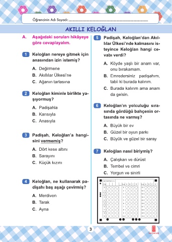 A. Aşağıdaki soruları hikâyeye 5 Padişah, Keloğlan’dan Akıl-