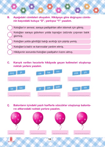 B. Aşağıdaki cümleleri okuyalım. Hikâyeye göre doğruysa cümle-