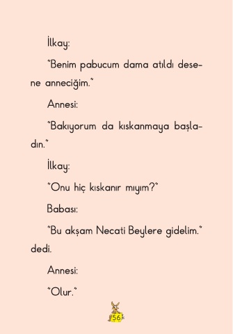 İlkay: “Benimpabucumdamaatıldıdese- neanneciğim.” Annesi: “Bakıyorumdakıskanmayabaşla- dın.” İlkay: “Onuhiçkıskanırmıyım?” Babası: “BuakşamNecatiBeyleregidelim.” dedi. Annesi: “Olur.” 56