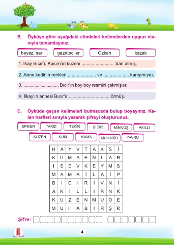 C. Öyküde geçen kelimeleri bulmacada bulup boyayınız. Ka-