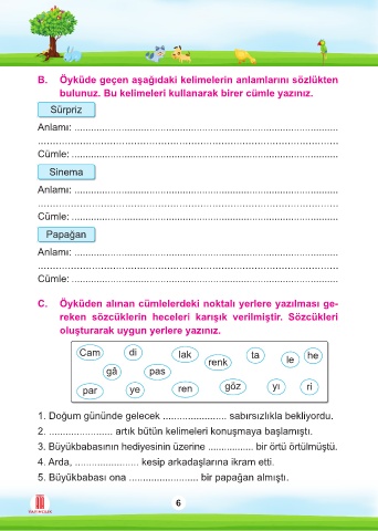 B. Öyküde geçen aşağıdaki kelimelerin anlamlarını sözlükten