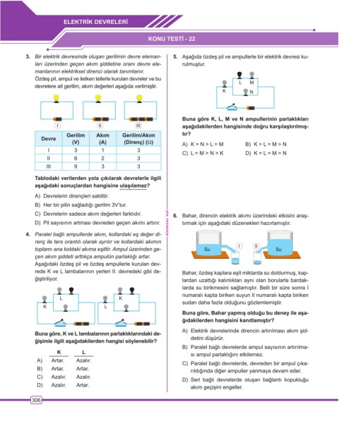 Buna göre K, L, M ve N ampullerinin parlaklıkları