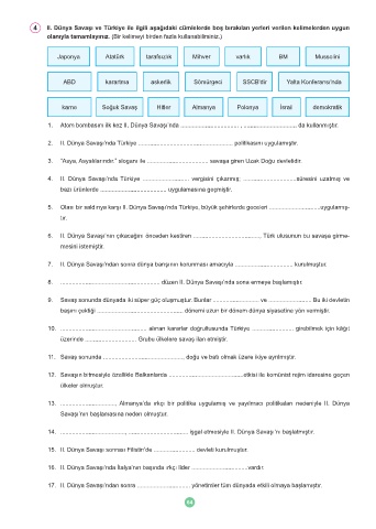 4 II. Dünya Savaşı ve Türkiye ile ilgili aşağıdaki cümlelerde boş bırakılan yerleri verilen kelimelerden uygun