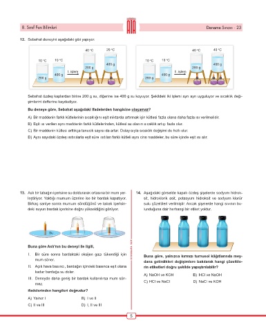 13. Aslı bir tabağın içerisine su doldurarak ortasına bir mum yer- 14. Aşağıdaki görselde kapalı özdeş şişelerde sodyum hidrok-