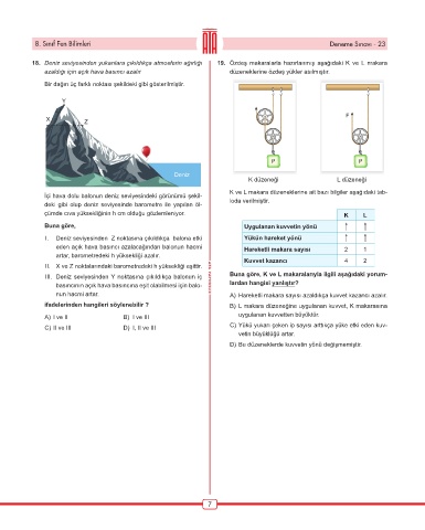III. Deniz seviyesinden Y noktasına çıkıldıkça balonun iç Buna göre, K ve L makaralarıyla ilgili aşağıdaki yorum-