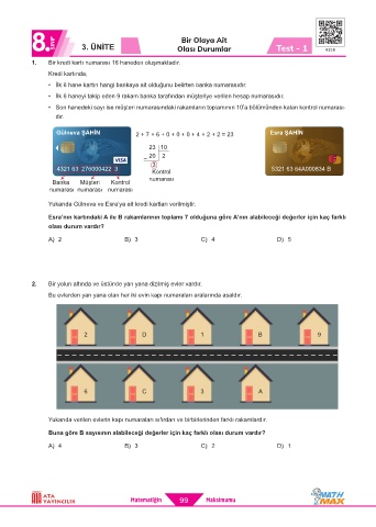 Esra’nın kartındaki A ile B rakamlarının toplamı 7 olduğuna göre A’nın alabileceği değerler için kaç farklı