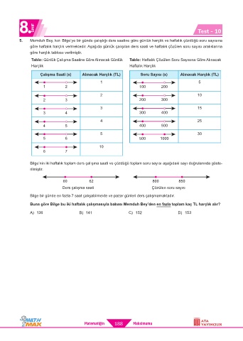 5. Memduh Bey, kızı Bilge’ye bir günde çalıştığı ders saatine göre günlük harçlık ve haftalık çözdüğü soru sayısına
