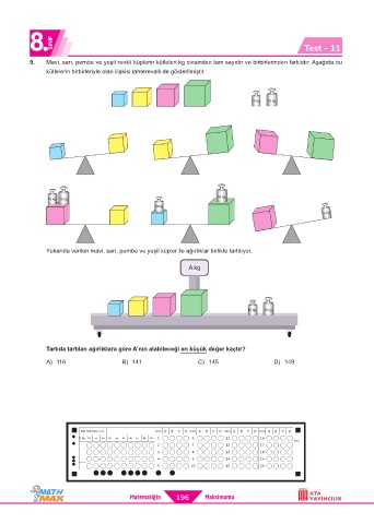 9. Mavi, sarı, pembe ve yeşil renkli küplerin kütleleri kg cinsinden tam sayıdır ve birbirlerinden farklıdır. Aşağıda bu