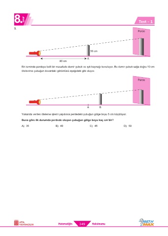 Buna göre ilk durumda perdede oluşan çubuğun gölge boyu kaç cm’dir?