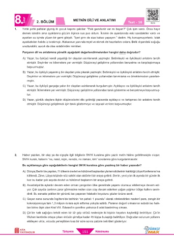 8 SINIF 2. BÖLÜM METNİN DİLİ VE ANLATIMI Test - 16 4626