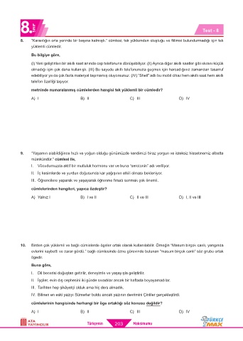8. “Karanlığın orta yerinde bir başına kalmıştı.” cümlesi, tek yüklemden oluştuğu ve fiilimsi bulundurmadığı için tek