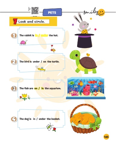 Answer Key PETS 7 7 Look and circle. 1 1 The rabbit is in / under in / under the hat. 2 2 The bird is under / on under / on the turtle. 3 3 The fish are on / in on / in the aquarium. 4 4 The dog is in / under in / under the basket. 145