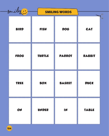 SMILING WORDS BIRD FISH DOG CAT FROG TURTLE PARROT RABBIT TREE BOX BASKET DUCK ON UNDER IN TABLE 154