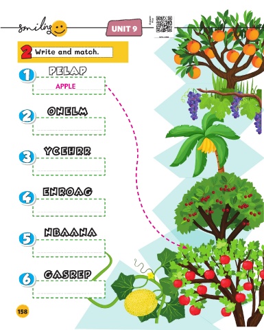 Answer Key UNIT 9 2 2 Write and match. PELAP 1 1 PELAP APPLE ONELM 2 2 ONELM YCEHRR 3 3 YCEHRR ENROAG 4 4 ENROAG NBAANA 5 5 NBAANA GASREP 6 6 GASREP 158