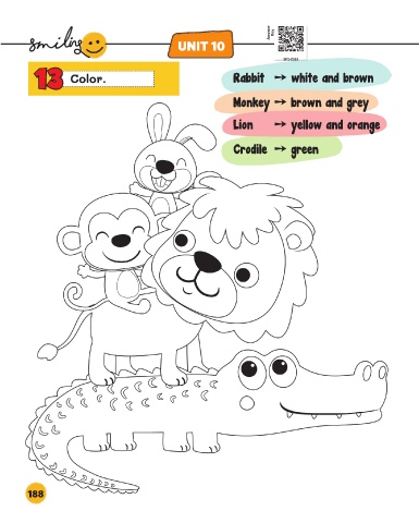 Answer Key UNIT 10 13 Color. Rabbit ➙ white and brown 13 Monkey ➙ brown and grey Lion ➙ yellow and orange Crodile ➙ green 188
