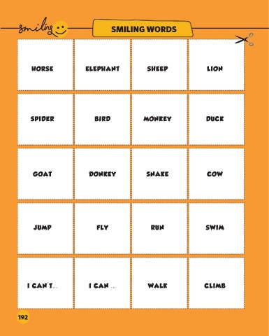SMILING WORDS HORSE ELEPHANT SHEEP LION SPIDER BIRD MONKEY DUCK GOAT DONKEY SNAKE COW JUMP FLY RUN SWIM I CAN'T... I CAN ... WALK CLIMB 192
