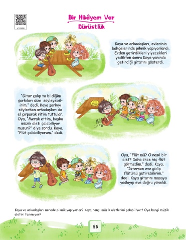 Kaya ve arkadaşları nerede piknik yapıyorlar? Kaya hangi müzik aletlerini çalabiliyor? Oya hangi müzik aletini tanımıyor? 56