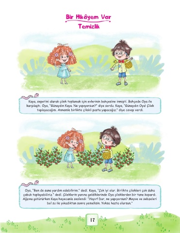 çabuk toplayabiliriz.” dedi. Çileklerin yanına geldiklerinde Oya çileklerden bir tane kopardı.