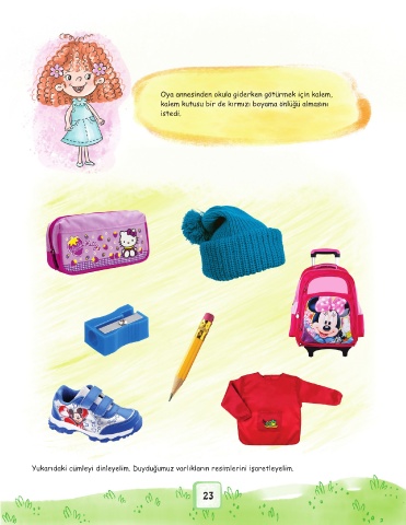 Oya annesinden okula giderken götürmek için kalem, kalem kutusu bir de kırmızı boyama önlüğü almasını istedi. Yukarıdaki cümleyi dinleyelim. Duyduğumuz varlıkların resimlerini işaretleyelim. 23