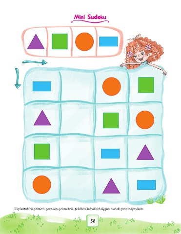 Boş kutulara gelmesi gereken geometrik şekilleri kurallara uygun olarak çizip boyayalım. 38
