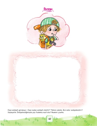 Ozan endişeli görünüyor. Ozan neden endişeli olabilir? Tahmin edelim. Bizi neler endişelendirir? Söyleyelim. Endişelendiğimizde yüz ifademiz nasıl olur? Resmini çizelim. 47