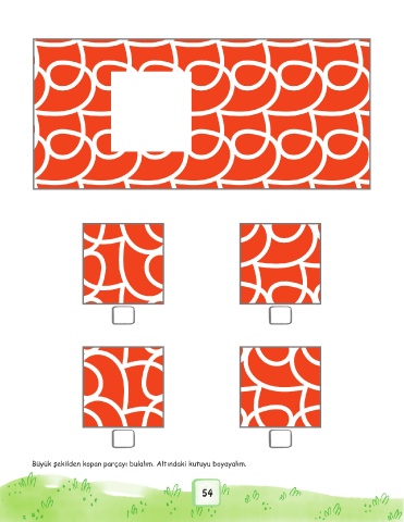 Büyük şekilden kopan parçayı bulalım. Altındaki kutuyu boyayalım. 54
