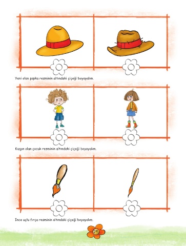 Yeni olan şapka resminin altındaki çiçeği boyayalım. Kızgın olan çocuk resminin altındaki çiçeği boyayalım. İnce uçlu fırça resminin altındaki çiçeği boyayalım. 25