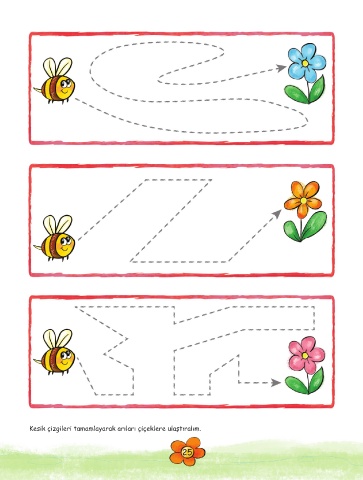 Kesik çizgileri tamamlayarak arıları çiçeklere ulaştıralım. 25
