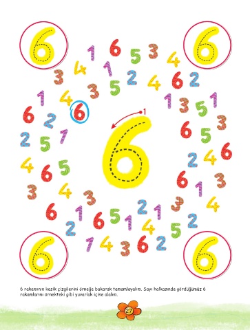 6 rakamının kesik çizgilerini örneğe bakarak tamamlayalım. Sayı halkasında gördüğümüz 6 rakamlarını örnekteki gibi yuvarlak içine alalım. 27