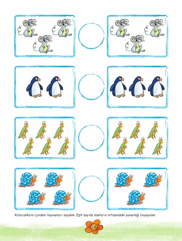 Kutucukların içindeki hayvanları sayalım. Eşit sayıda olanların ortasındaki yuvarlağı boyayalım. 28