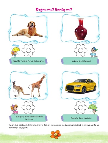 Yukarıdaki cümleleri dinleyelim. Görsel ile ilgili cevap doğru ise boyanmamış çiçeği kırmızıya, yanlış ise