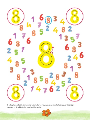 8 rakamlarının kesik çizgilerini örneğe bakarak tamamlayalım. Sayı halkasında gördüğümüz 8 rakamlarını örnekteki gibi yuvarlak içine alalım. 35