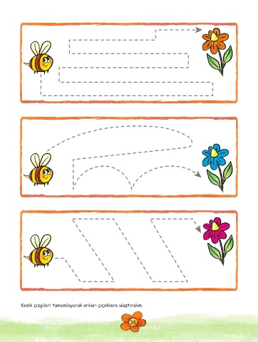 Kesik çizgileri tamamlayarak arıları çiçeklere ulaştıralım. 36