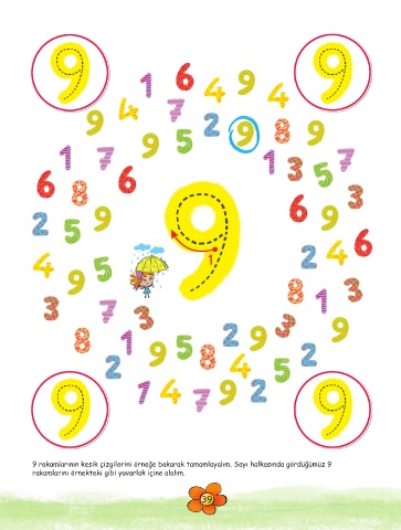 9 rakamlarının kesik çizgilerini örneğe bakarak tamamlayalım. Sayı halkasında gördüğümüz 9 rakamlarını örnekteki gibi yuvarlak içine alalım. 39